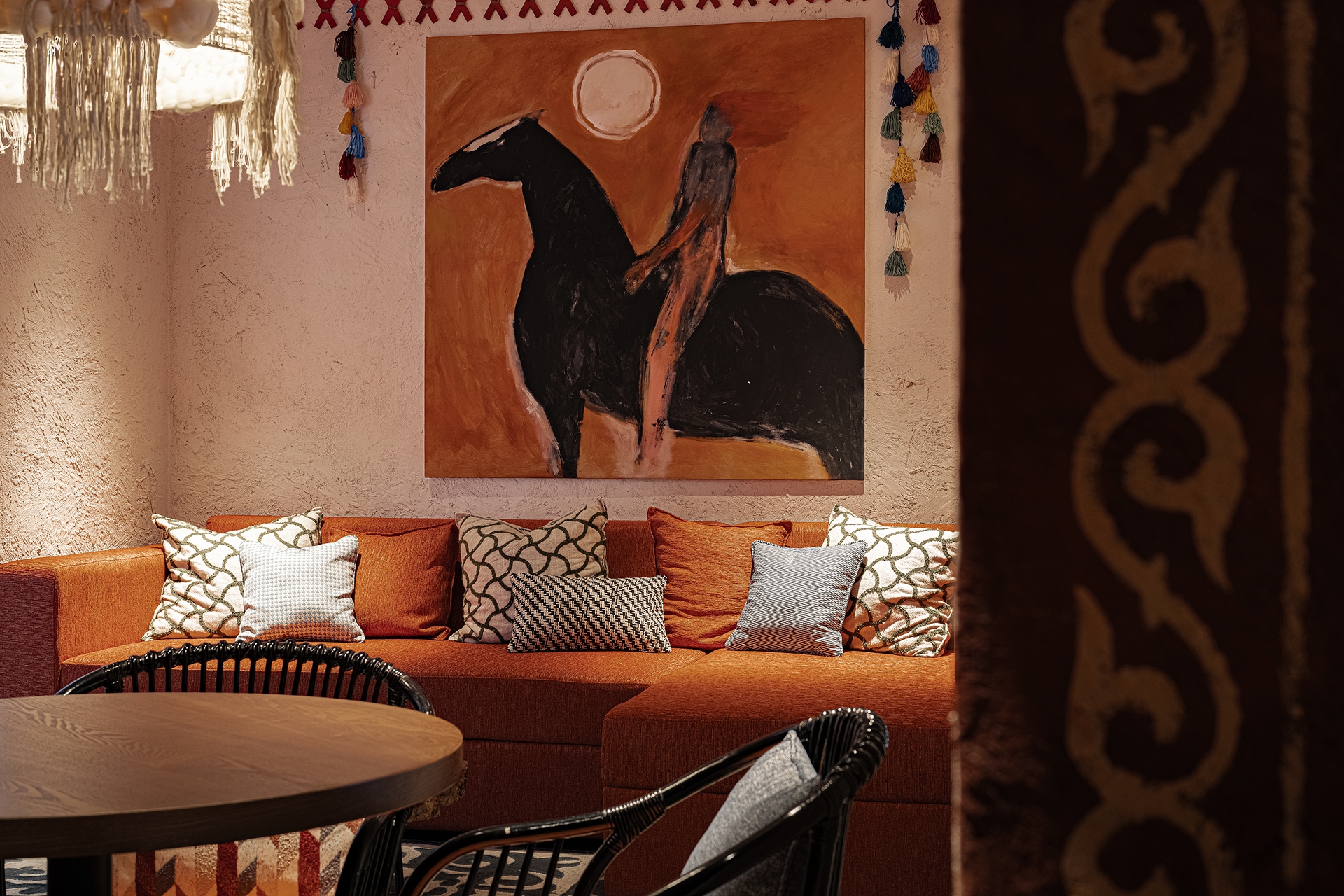Интерьерді жасауға қазақстандық суретшілер қатысты: шығармалары жарық, пейзаждар мен портреттер арқылы көшпелілер әлемінің тереңдігін бейнелейтін Азат Табиев және қабырғалар мен заттардағы ою-өрнектері кеңістікке қасиетті мағынаны қайтаратын кескіндемеші Анель Ошан.