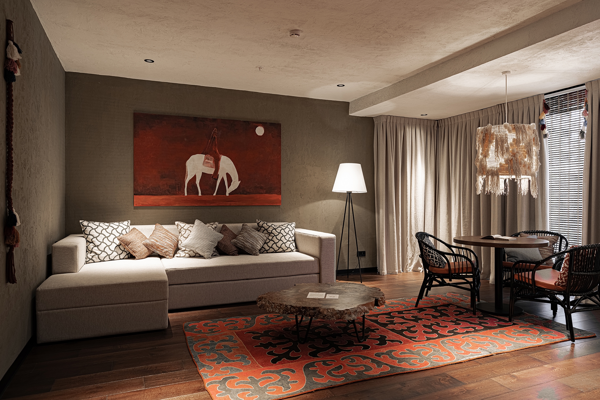 Алматыдағы YURTA бутик-қонағы көшпелілер мұрасын заманауи жайлылықпен үйлестіреді. Интерьер этникалық стильде безендірілген: ағаш, тоқыма, ою, табиғи бөлшектер.