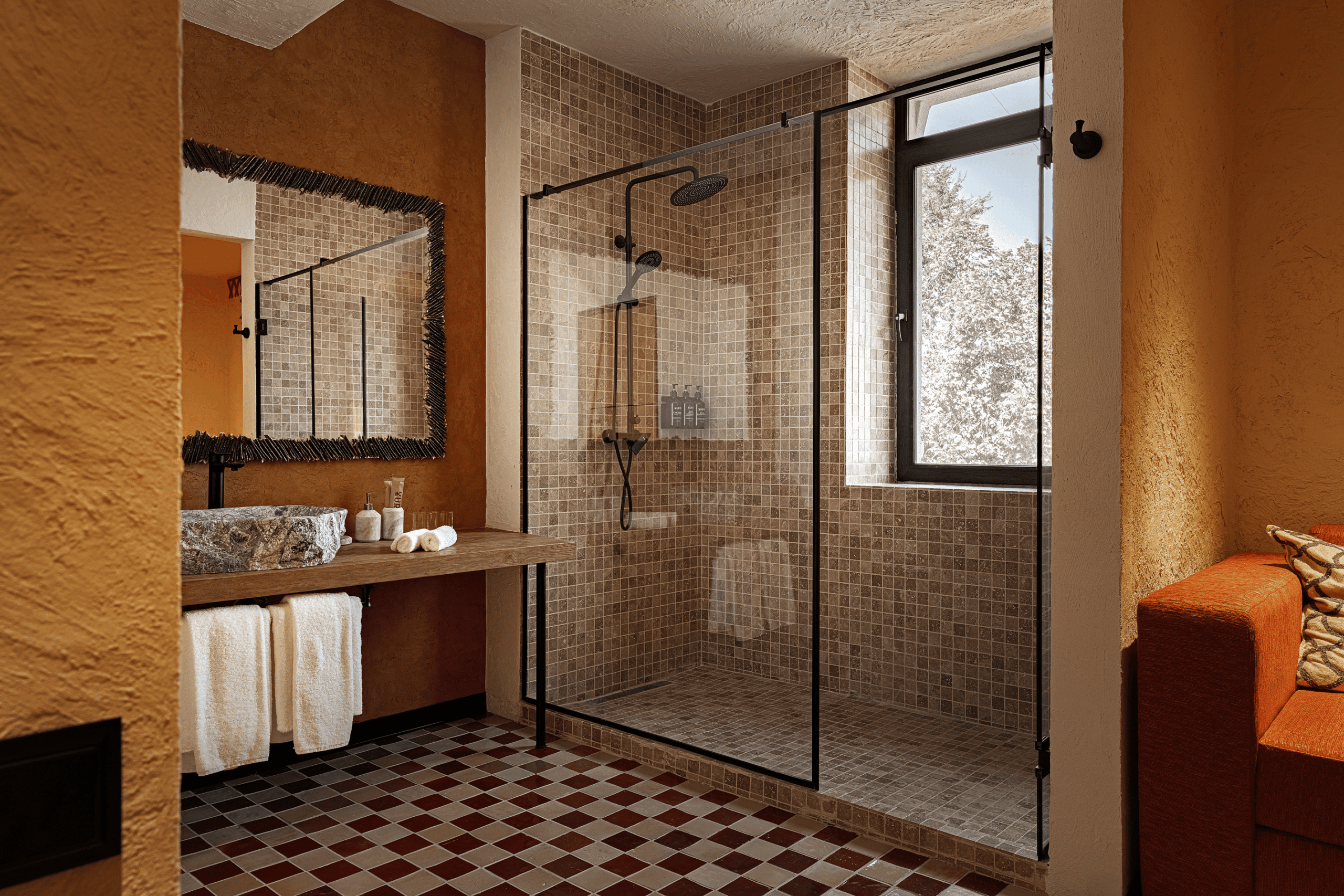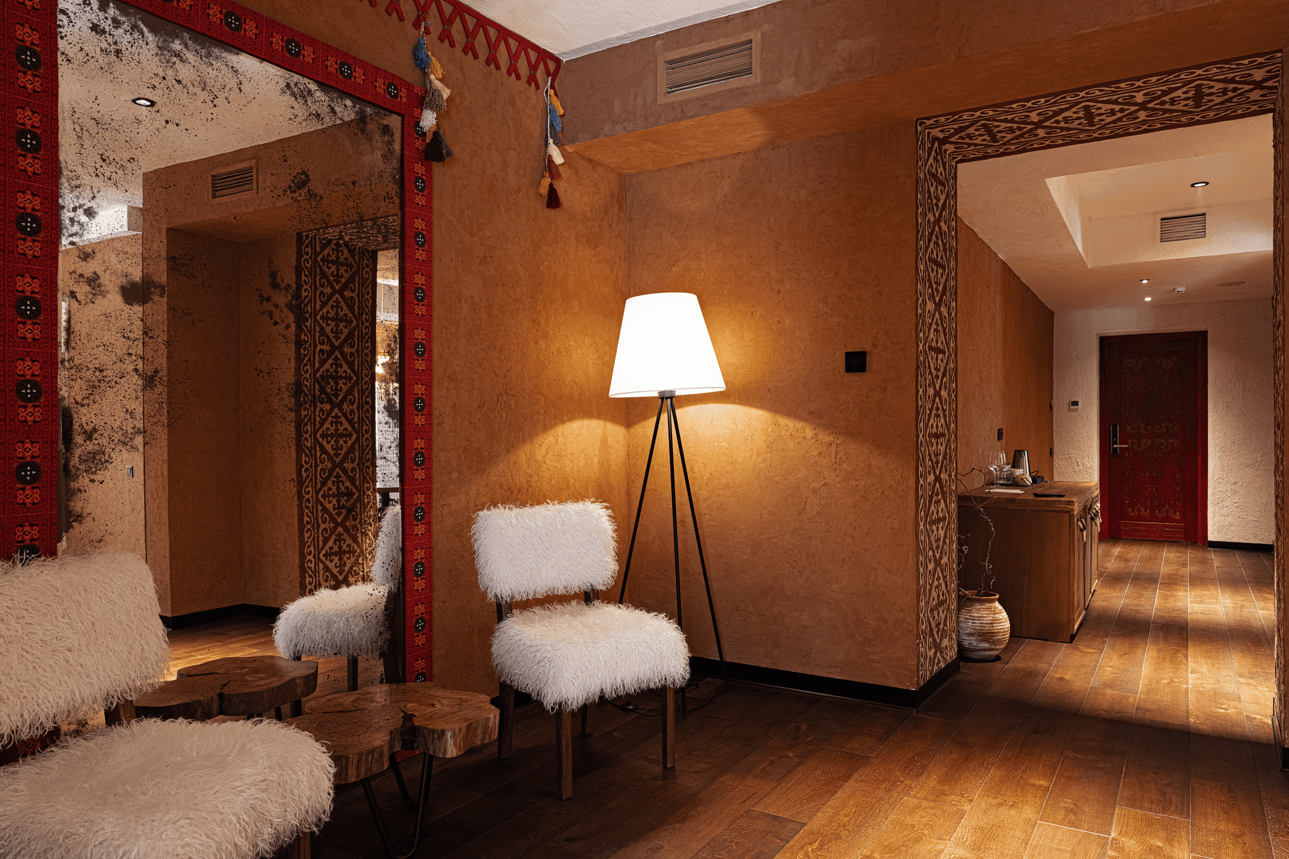 Люкс — просторный двухкомнатный номер в бутик-отеле YURTA ALMATY для тех, кому важно «жить в номере», а не просто ночевать. Здесь есть отдельная зона отдыха с мягкой мебелью и полноценная спальня — удобно и для спокойного семейного проживания, и для поездок, где хочется больше личного пространства.